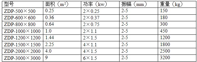 注:此表為上、下振形式振動平臺技術參數,僅供參考;此外可以根據用戶實際使用需要定做臺面大小來選用振動電機數量及功率。